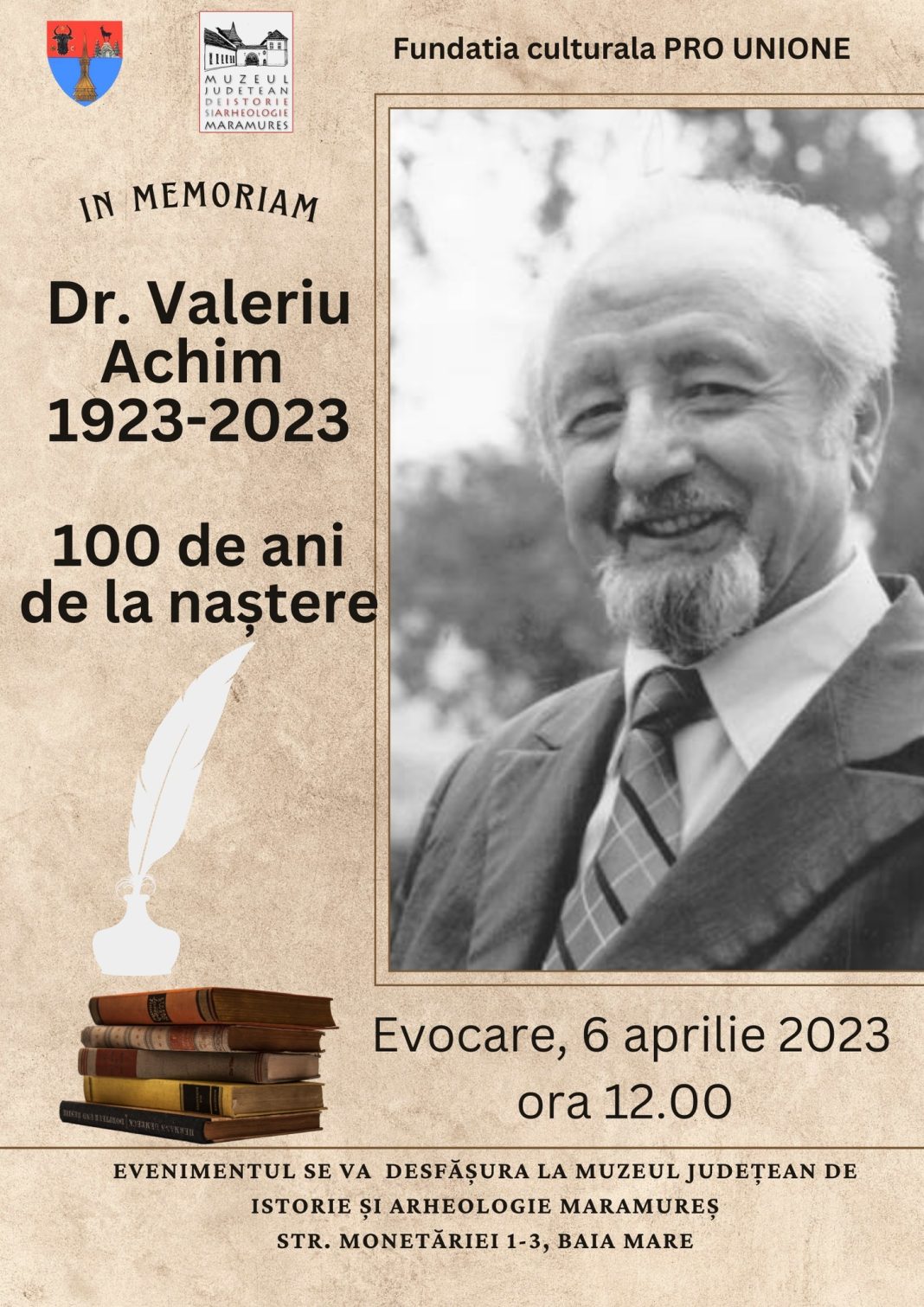 Consiliul Judeศean Maramureศ, prin Muzeul Judeศean de Istorie ศi Arheologie Maramureศ din Baia Mare vฤ invitฤ joi, 6 aprilie 2023, ora 12:00, la evenimentul de marcare a 100 de ani de la naศtere a prof. dr. Valeriu Achim (1923-2014).